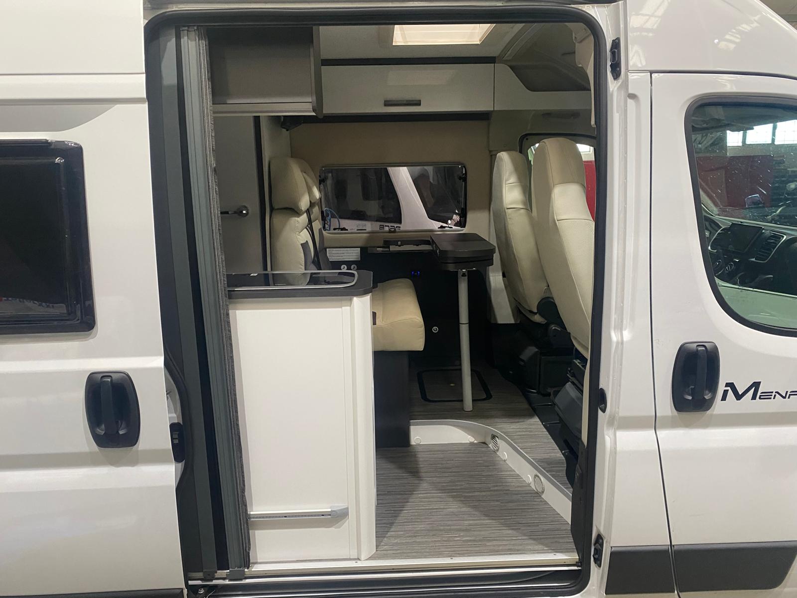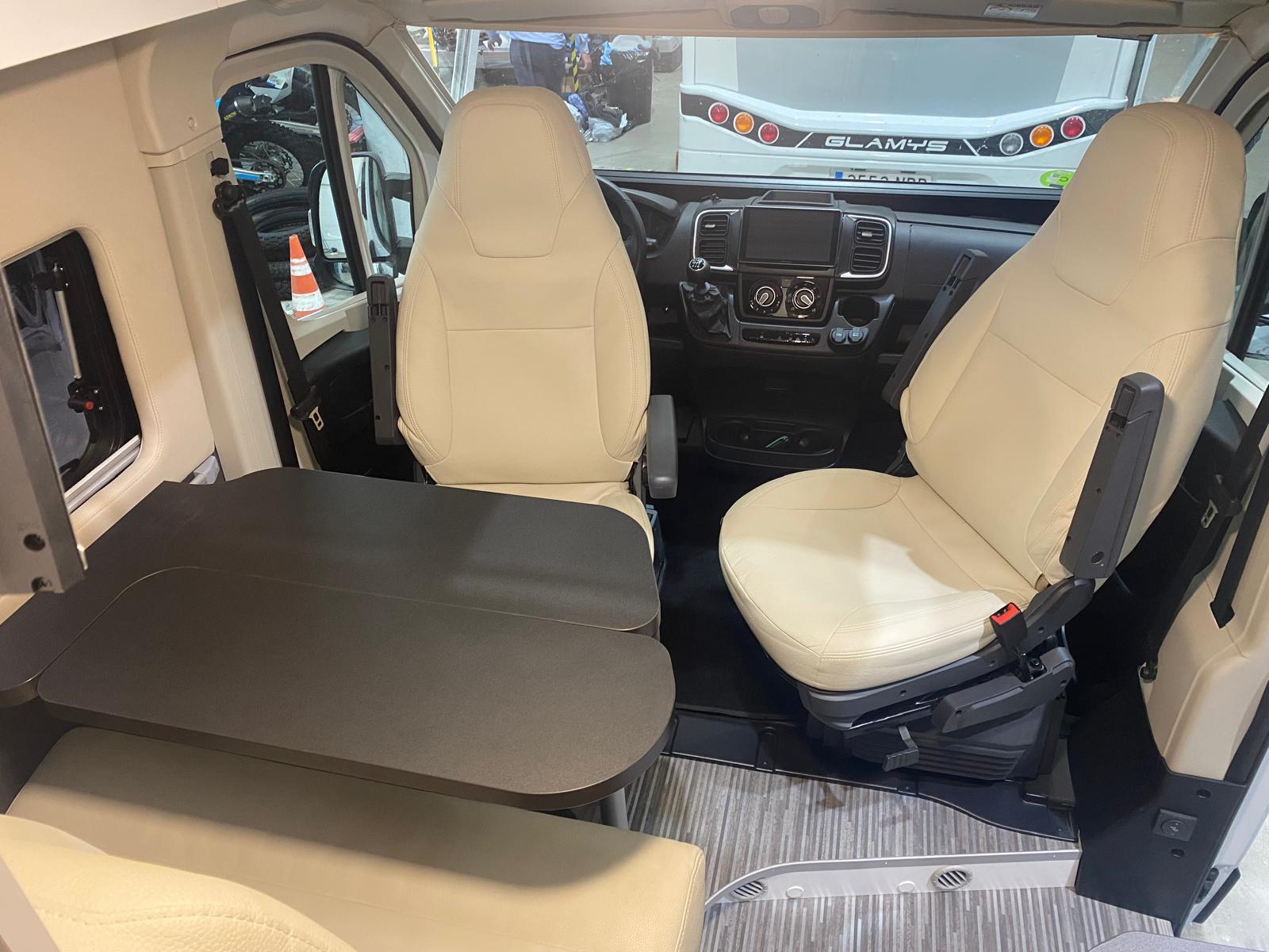 Panneau solaire, batterie supplémentaire, caméra de recul, garage, réfrigérateur, climatisation, ustensiles de cuisine, table et chaises, bouteille de gaz et sièges enfant.