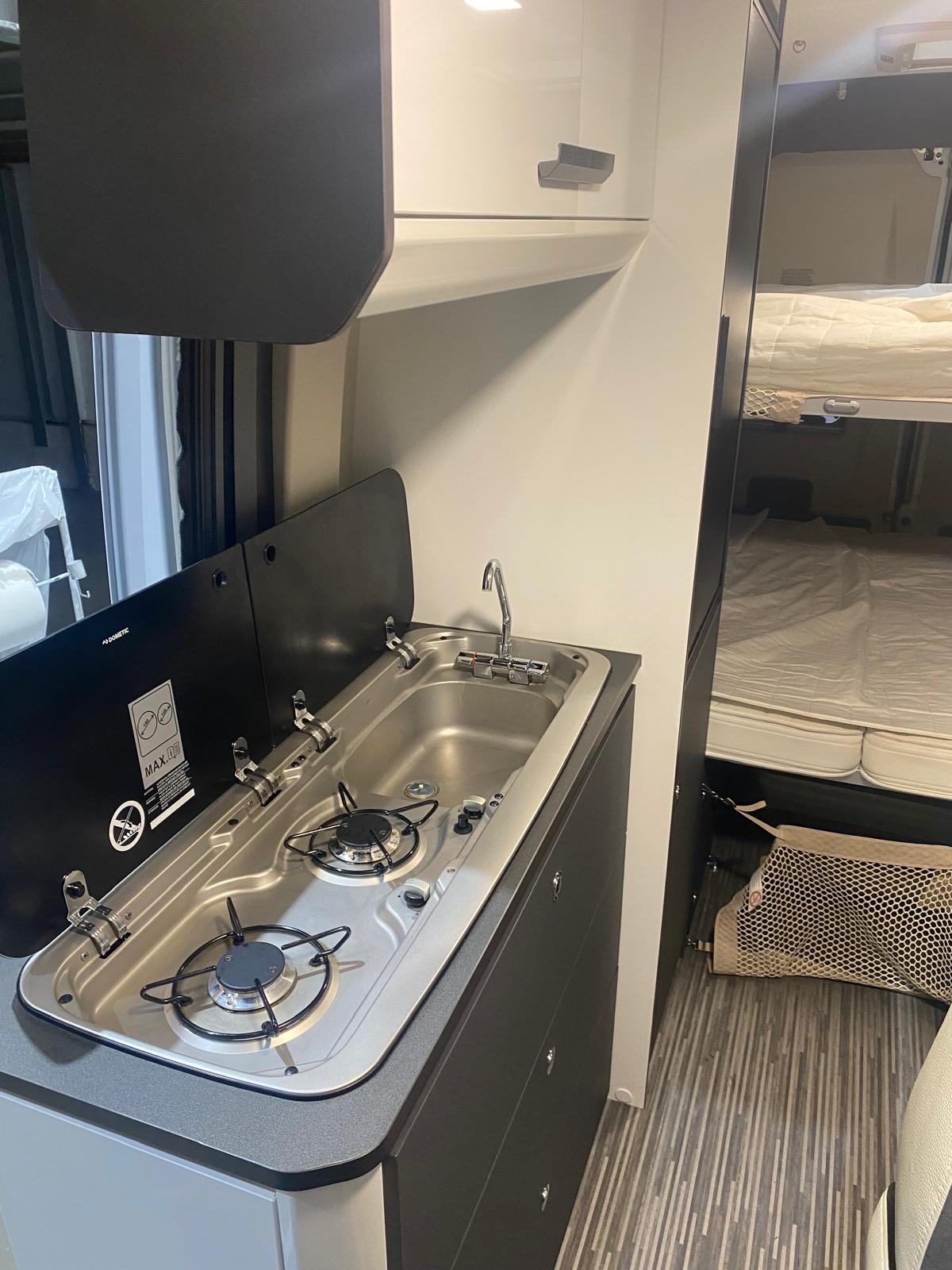 Panneau solaire, batterie supplémentaire, caméra de recul, porte-vélos Thule, réfrigérateur de 84 litres, ustensiles de cuisine, table et chaises, bouteille de gaz et sièges enfant.