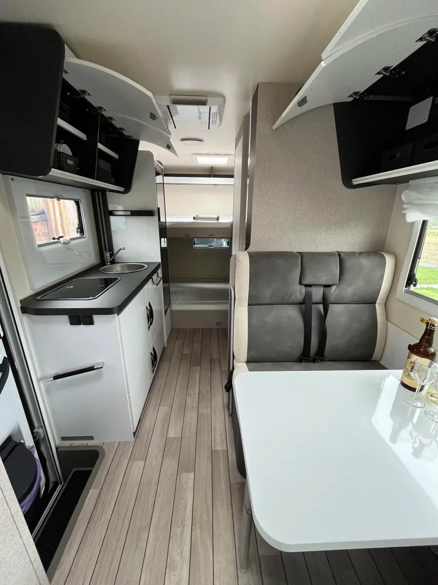 Panneau solaire, batterie supplémentaire, caméra de recul, garage, réfrigérateur de 70 litres, ustensiles de cuisine, table et chaises, bouteille de gaz et sièges enfant.